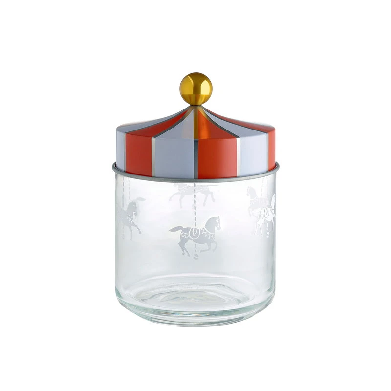 Die Glasgefäße Circus von Alessi sind mit weißen Karussellpferden verziert. Der rot-weiße Metalldeckel besitzt einen Dichtungsring und einen goldenen Knauf. Die Gefäße sind in verschiedenen Größen erhältlich.